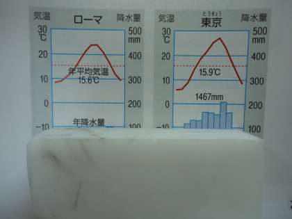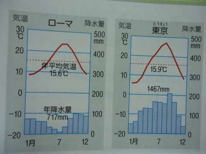 上のグラフは、月ごとの平均気温、平均降水量により、ローマと東京の比較ができるように示されています。