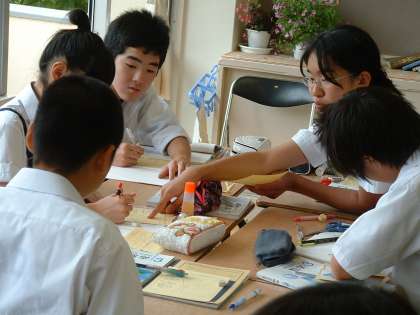 写真は,より良い答を求めてグループで検討している学習場面です。