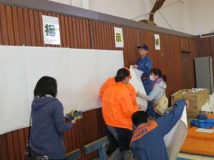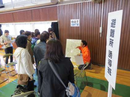 白山小の先生方が中心になり、避難所設営が始まりました。班ごとの分担作業の確認も順調です。