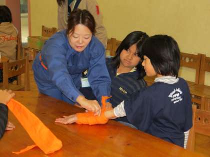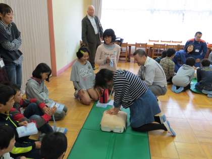 高学年の児童は心肺蘇生や骨折時の応急処置について真剣に学んでいます。