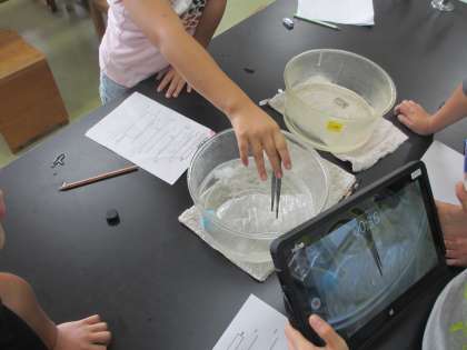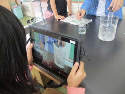 子供たちは,グループごとに様々な実験を行い,タブレットで実験の様子を動画撮影しています。