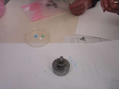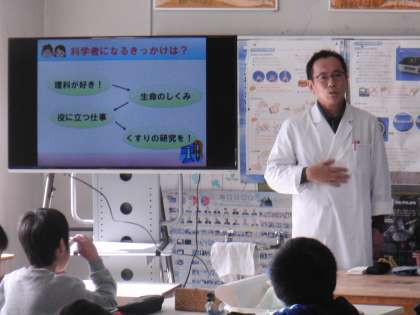 写真は製薬会社の研究職の方に来校していただき,「薬作り」を「ものの溶け方」の理科の授業と結びつけた体験授業です。