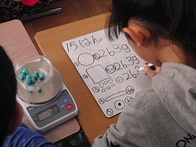写真は理科「ものの形を変えると重さは変わるだろうか」という実験の最中です。