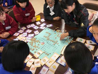 「Awesome!」「Thank you.」フラッシュカードを見てのとっさの英語、お金の模型を使った買い物練習、クロスワードゲームなど、ゲームや動きのある活動の中で、さまざまな場面での英会話を練習しました。