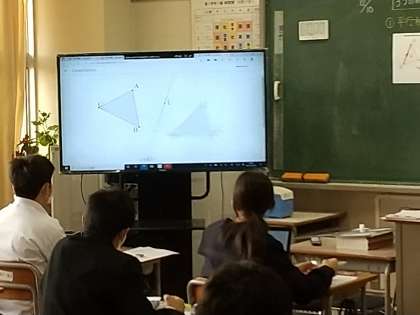 数学用アプリGeoGebraで作成した教材を用いて、各自が学習者用タブレットPCを使って、平面図形の3つの移動についてその特徴を調べ、発表した。