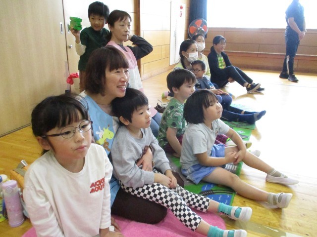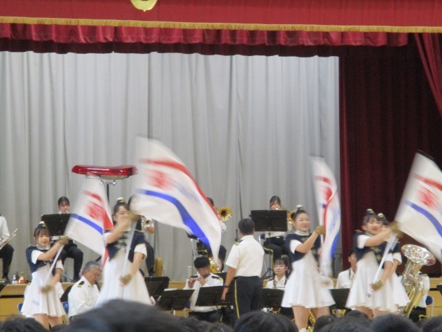 音楽隊の迫力のある演奏と、カラーガード隊の華やかさに夢中になっていた子どもたちです。
