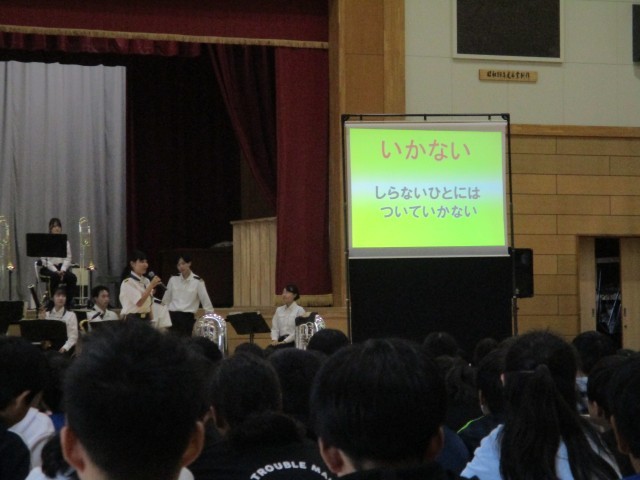 演奏の合間には、横断歩道の渡り方や不審者に出会った時の「いかのおすし」の約束などを学ぶコーナーもあり、