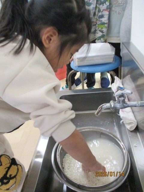前日には年長さんが中心になってもち米を洗って準備してくれました。