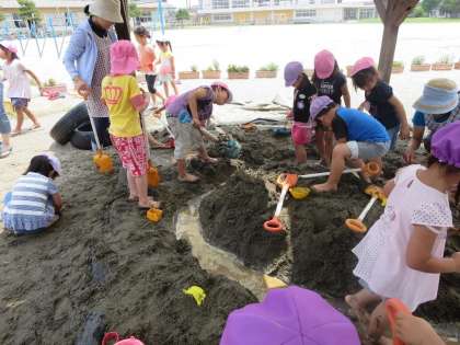 今日は、蒸し暑く気温は28度ありました。子ども達は、シャベルで掘ったり水をいれたりして、川づくりを楽しんでいました。泥んこになっておおはりきりです。バケツに水を汲んで川になるように何回も運んで、水汲みは並んで順番をまっていました。