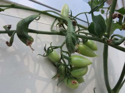 夏休み前から育てているすみれ組のミニトマト。まだ緑色ですがだんだん実が大きくなってきました。丸い実が並ぶ中に、どんぐりのような形のトマトを発見!あまり見ない形ですが…どんな味がするのか楽しみですね!