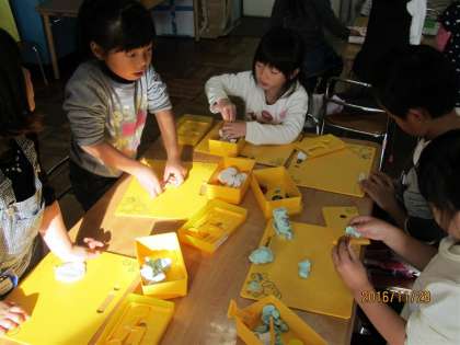 すみれ組は『ジャンケン列車』『おおあらし』というゲーム遊び、さくら組はトランプや粘土などのコーナー遊びを一緒に楽しみました。
