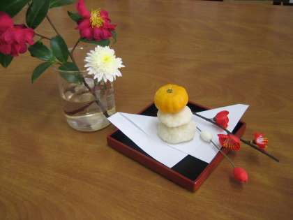 (写真*お餅つきの時に、みんなでこねて作った鏡餅と子ども達の制作です。)