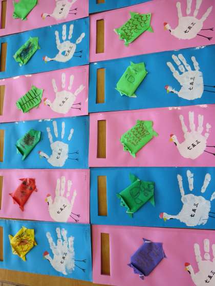 すみれ組は、手形の鶴と、折り紙で亀を折って作りました。