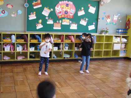 園長先生の園内放送で、各保育室でやっています。