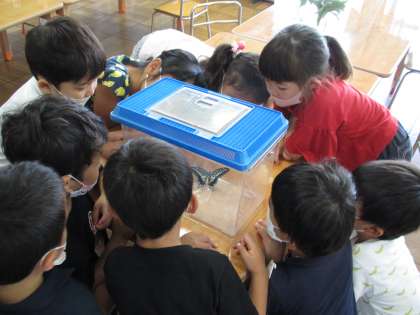 羽化する場面が見られるように細工をしていたのですが、登園するとすでにきれいなチョウになっていました。