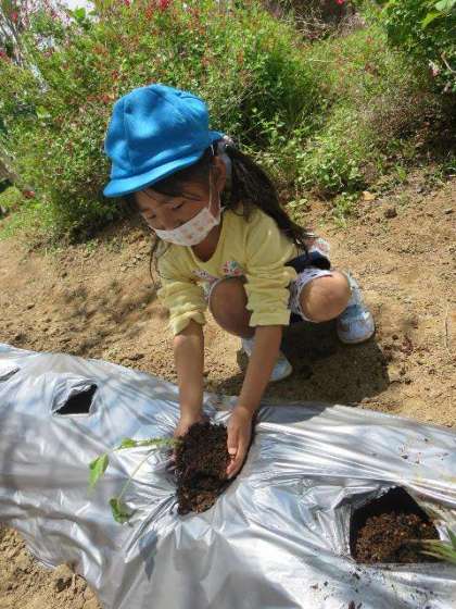 子ども達の手でさつまいも、ゴーヤ、えだまめを植えてもらった様子です。
