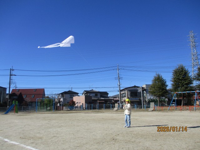 いい風が吹いてきて、絶好の凧あげ日和です。寒さも忘れるくらい、元気いっぱい走って...