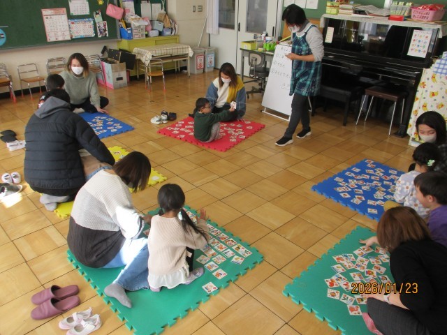 午後から保育参観でおうちの方に来ていただき、いっしょにお正月遊びをしました。かる...